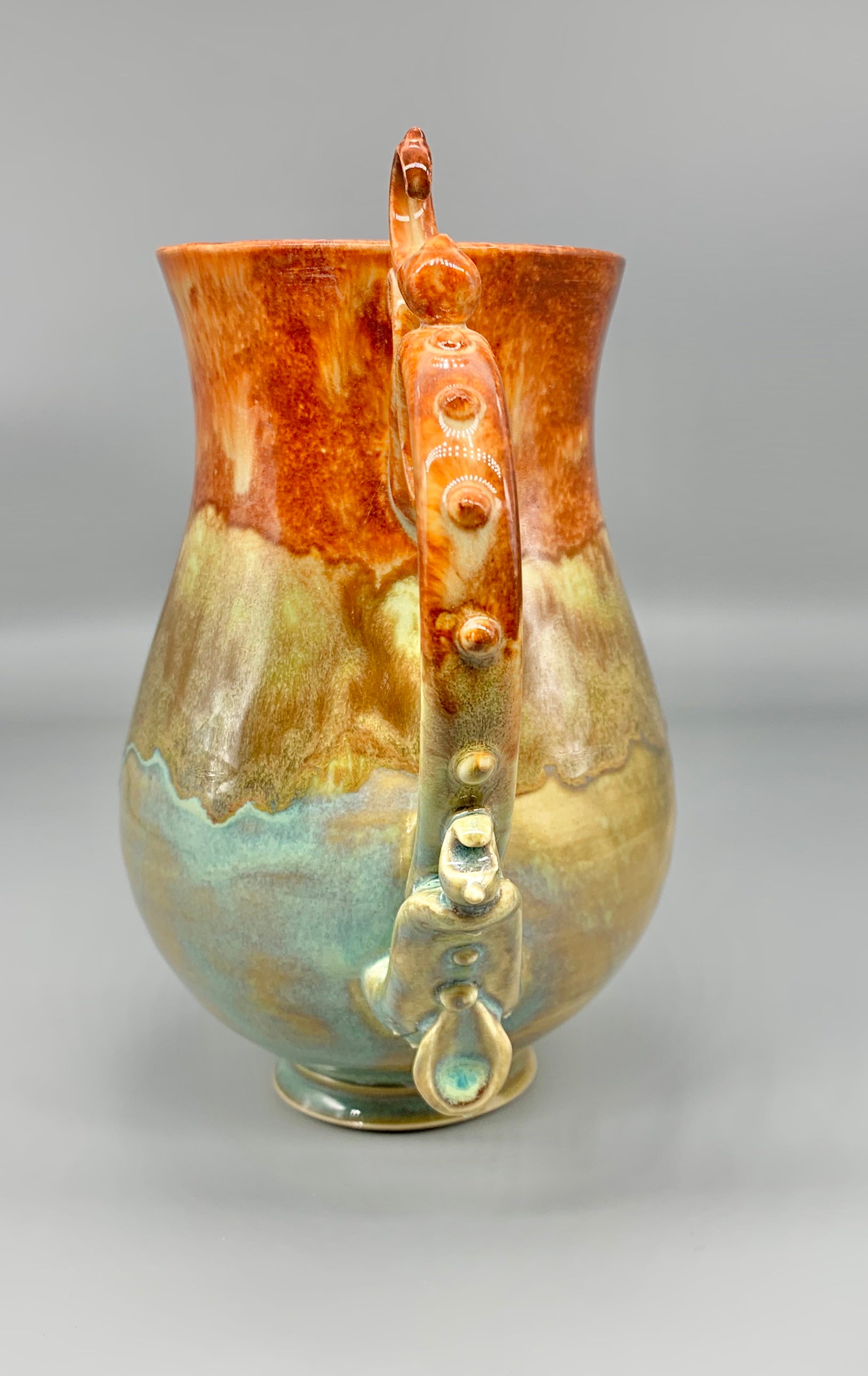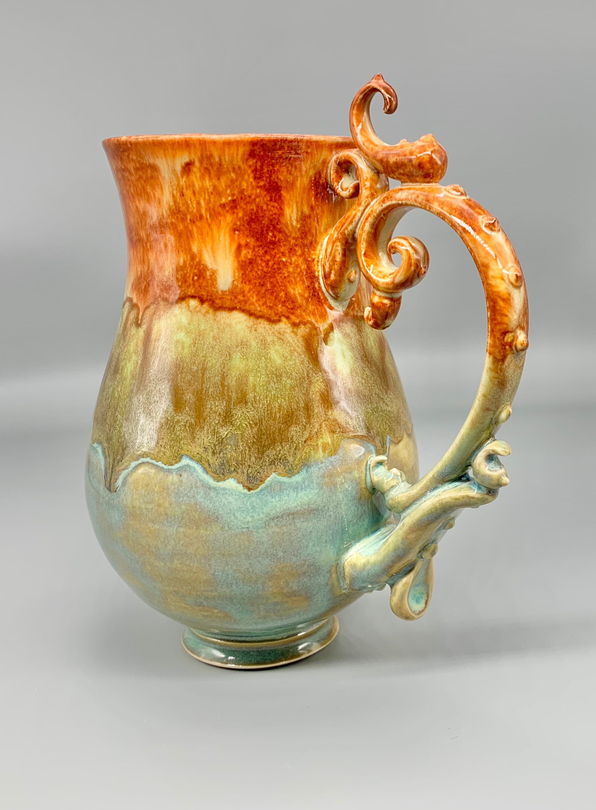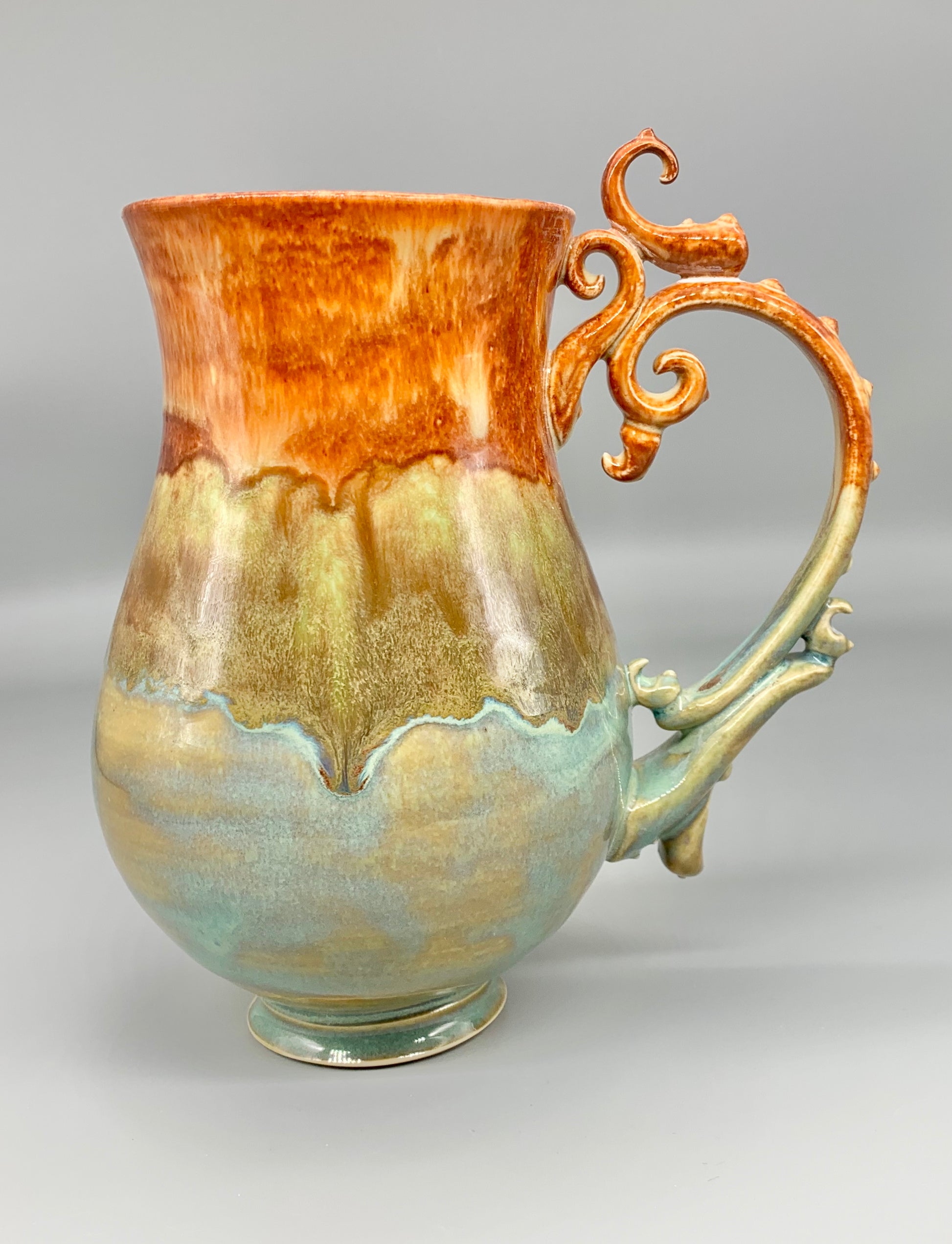 A lovely glossy orange, green, and blue porcelain mug 6.25”H x 4.25W