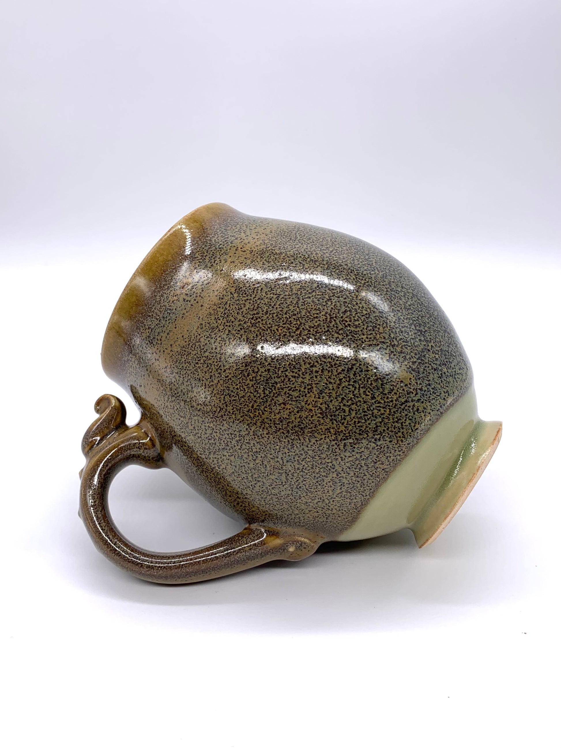 A lovely porcelain speckled gold, blue, and green mug 4.25”H x 4.25W