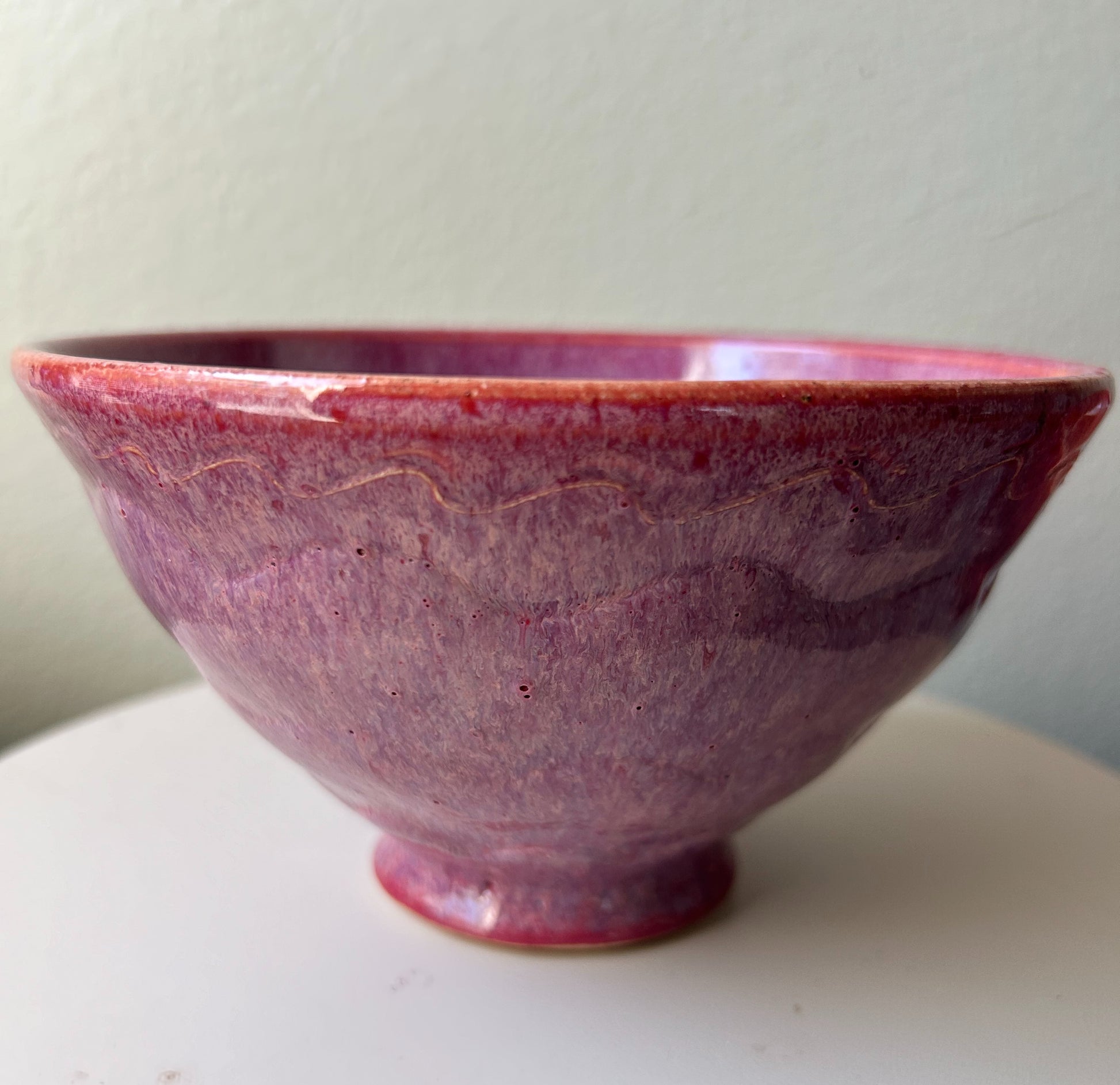 A beautiful pink and purple bowl with an undulating texture and pattern, stoneware 4”H x 6”W