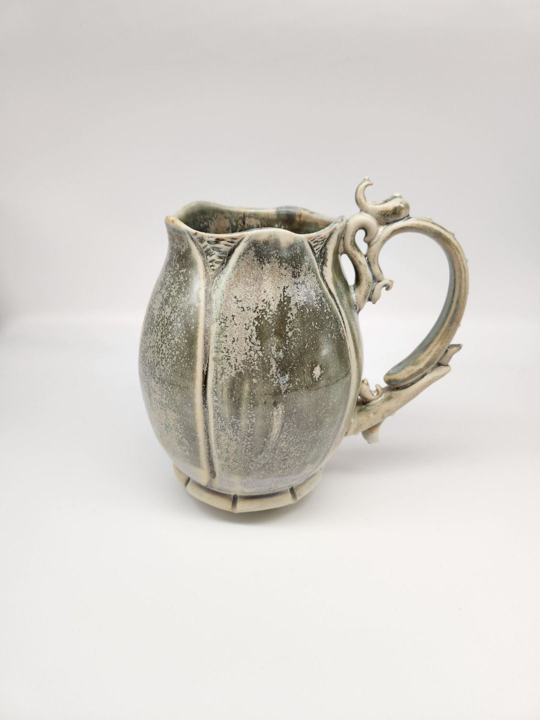 A lovely glossy blue and green speckled porcelain mug in a tulip shape 6.25”H x 4.25W
